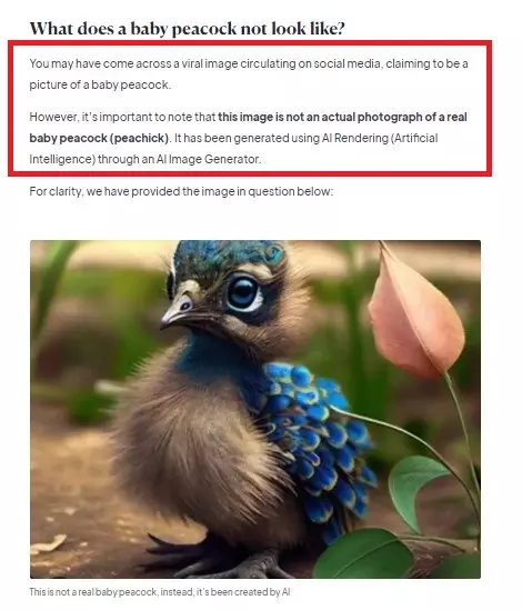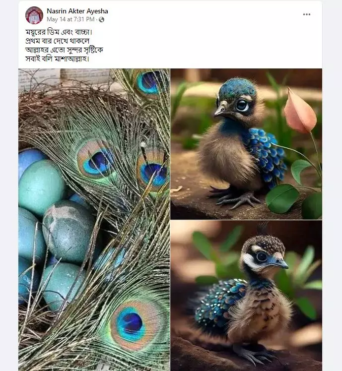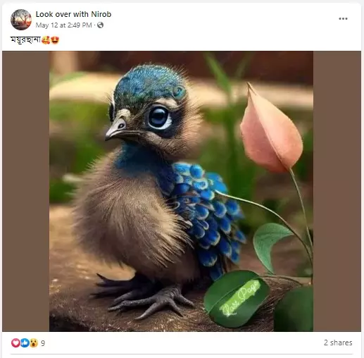 সুতরাং এআই প্রযুক্তির মাধ্যমে তৈরি একটি ময়ূরছানার ছবিকে বিভ্রান্তিকরভাবে ফেসবুকে প্রচার করা হচ্ছে।