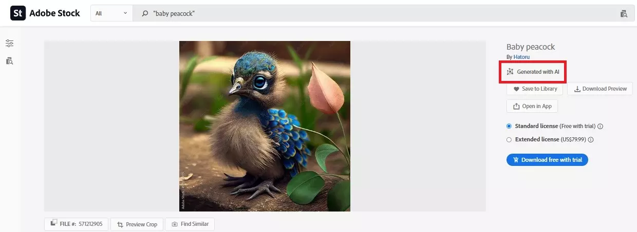 ছবিটির রিভার্স ইমেজ সার্চ করে অনলাইন ফটো স্টকার ওয়েবসাইট এডোব স্টকে 'Baby peacock' শিরোনামে একটি কালেকশনে আলোচ্য ছবিটি খুঁজে পাওয়া যায়। ছবিটির বর্ণনা অংশ থেকে জানা যায়, হাতোরু নামের একটি এআইভিত্তিক ছবি তৈরিকারক আইডি থেকে আলোচ্য ছবিটি পোস্ট করা হয়। এছাড়াও, ছবিটির বর্ণনা অংশে 'Generated with AI' লেখা থাকতে দেখা যায়। অর্থ্যাৎ ছবিটি কৃত্রিম বুদ্ধিমত্তার সাহায্যে তৈরি করা হয়েছে। স্ক্রিনশট দেখুন--