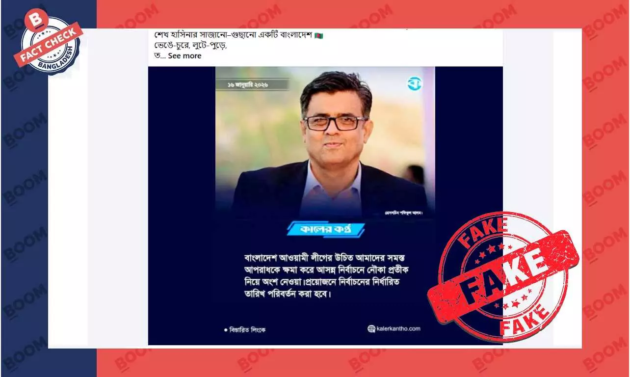 অর্থাৎ কালের কণ্ঠের লোগো ব্যবহার করে প্রেস সচিব শফিকুল আলমের বরাতে সরকারের পক্ষ থেকে তিনি আওয়ামী লীগের কাছে ক্ষমা চেয়েছেন এবং দলটিকে নির্বাচনে আসার আহ্বান জানিয়েছেন-- এমন মন্তব্যযুক্ত ভুয়া ফটোকার্ড প্রচার করা হচ্ছে। কালের কণ্ঠ এমন কোনো খবর কিংবা ফটোকার্ড প্রকাশ করেনি।