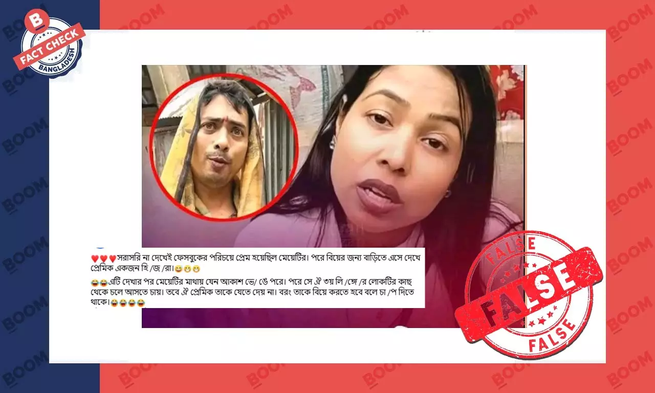 সামাজিক মাধ্যম ফেসবুকে তৃতীয় লিঙ্গের একজন ব্যক্তির জোর করে এক নারীকে বিয়ে করতে চাওয়ার একটি ভিডিও পোস্ট করে বলা হচ্ছে, বাড়ি ছেড়ে বিয়ে করতে চলে এসে ওই নারী জানতে পারেন যাকে পুরুষ ভেবেছিলেন ওই ব্যক্তি আসলে একজন তৃতীয় লিঙ্গের ব্যক্তি । এরকম কয়েকটি ফেসবুক পোস্ট দেখুন এখানে, এখানে, এখানে, এখানে ও এখানে।