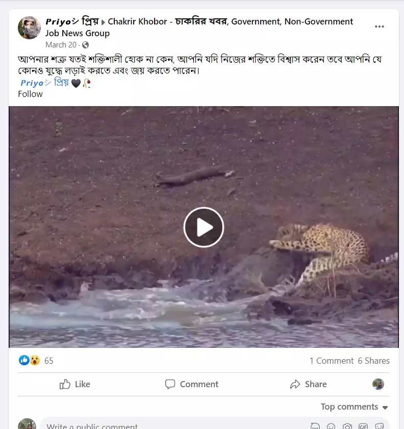 গত ২০ মার্চ 'Chakrir Khobor - চাকরির খবর, Government, Non-Government Job News Group' নামের একটি গ্রুপে '𝙋𝙧𝙞𝙮𝙤シ︎ প্রিয়' নামের আইডি থেকে একটি ভিডিও পোস্ট করে বলা হয়, "আপনার শত্রু যতই শক্তিশালী হোক না কেন, আপনি যদি নিজের শক্তিতে বিশ্বাস করেন তবে আপনি যে কোনও যুদ্ধে লড়াই করতে এবং জয় করতে পারেন।" দেখুন ওই পোস্টের স্ক্রিনশট--