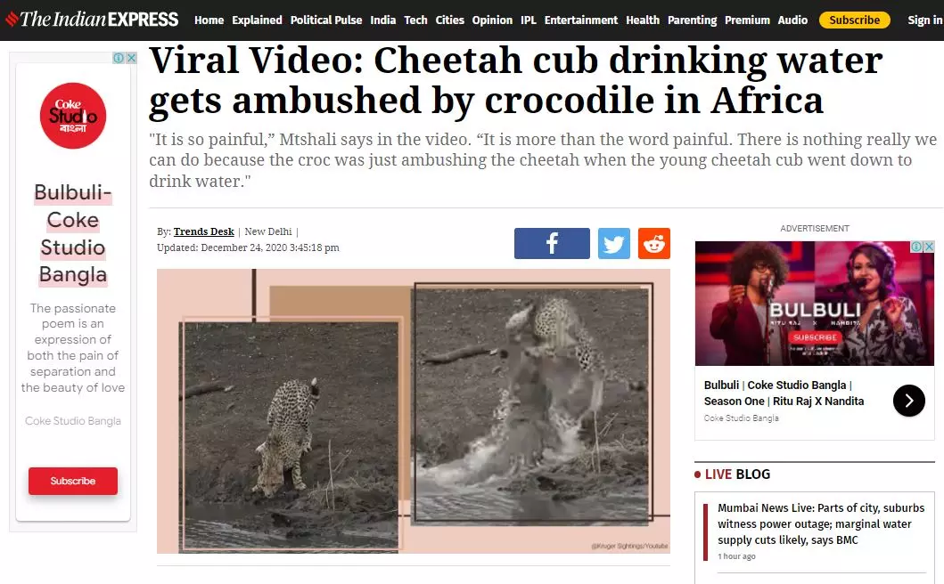 উক্ত ভিডিওটি সামাজিক মাধ্যমে ভাইরাল হলে এ নিয়ে ভারতীয় সংবাদমাধ্যম 'The Indian Express'-এ "Viral Video: Cheetah cub drinking water gets ambushed by crocodile in Africa" শিরোনামে একটি প্রতিবেদন প্রকাশিত হয়। এতে বলা হয়, দক্ষিণ আফ্রিকার একটি জলাধারে পানি পানের সময় একটি চিতা শাবককে আক্রমণ করে টেনে নিয়ে যায় একটি কুমির, এই ঘটনাটি ভাইরাল হয়েছে। দেখুন প্রতিবেদনটির স্ক্রিনশট--