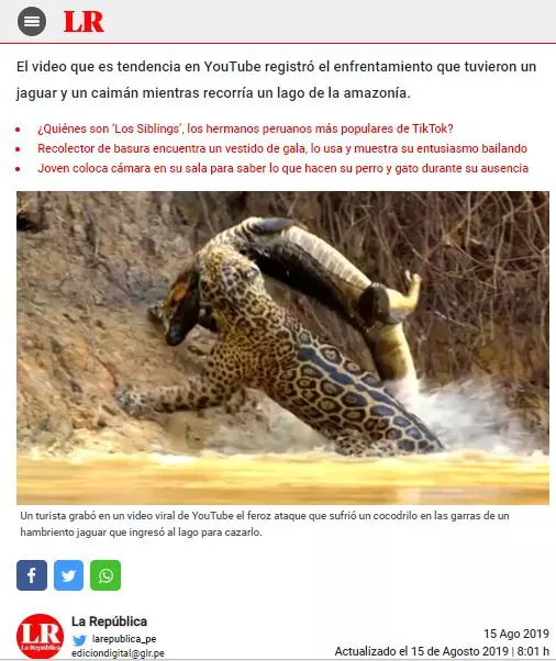 এদিকে এই ভিডিওটিও কিছুদিন পর সামাজিক মাধ্যমে ভাইরাল হয়, এর প্রেক্ষাপটে 'Hambriento jaguar ataca sin piedad a cocodrilo y brutal pelea tiene inesperado final [VIDEO]' শিরোনামে স্প্যানিশ ভাষার প্রভাবশালী সংবাদ মাধ্যম 'La Republica' একটি প্রতিবেদন প্রকাশ করে। গুগল স্বয়ংক্রিয় অনুবাদের মাধ্যমে প্রতিবেদনটি থেকে জানা যায়, ব্রাজিলের আমাজন বনে নদীতে একটি কুমিরের উপর হিংস্র জাগুয়ার ঝাপিয়ে পড়ে এবং এটিকে শিকারে পরিণত করে। ভিডিওটি ইউটিউব ও সামাজিক মাধ্যমে লাখ লাখ ইন্টারনেট ব্যবহারকারী দেখেছে। দেখুন পত্রিকাটির স্ক্রিনশট--