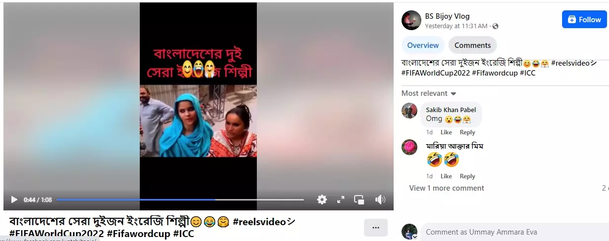 গত ২২ জুন 'BS Bijoy Vlog' নামের একটি ফেসবুক পেজ থেকে একটি ভিডিও পোস্ট করে লেখা হয়, "বাংলাদেশের সেরা দুইজন ইংরেজি শিল্পী😊😂🤗 #reelsvideoシ #FIFAWorldCup2022 #Fifawordcup #ICC"। ভিডিওটিতে দুজন নারীকে ইংরেজি ভাষায় কানাডিয়ান শিল্পী জাস্টিন বিবারের 'Baby' গানটি গাইতে দেখা যায়। ফেসবুক পোস্টটির স্ক্রিনশট দেখুন--