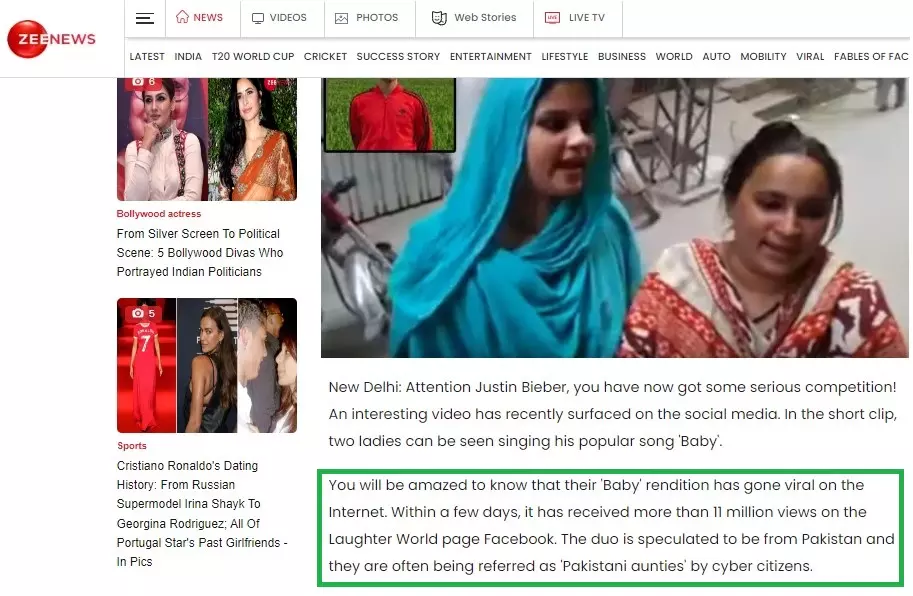 ভিডিওটি থেকে কি ফ্রেম কেটে নিয়ে রিভার্স ইমেজ সার্চ করে ভারতীয় গণমাধ্যম জি নিউজের ওয়েবসাইটে ২০১৭ সালের ৯ জুন "These 'Pakistani aunties' can give Justin Bieber a tough run for money with their 'Baby' rendition! - WATCH viral video" শিরোনামে প্রকাশিত একটি প্রতিবেদনে আলোচ্য ভিডিওটির একটি স্ক্রিনশট খুঁজে পাওয়া যায়। প্রতিবেদনটিতে স্ক্রিনশটে দেখানো এই দুই নারী পাকিস্তানের বলে উল্লেখ করা হয়। জাস্টিন বিবারের গাওয়া বেবি গানটি গেয়ে তারা ভাইরাল হন। স্ক্রিনশট দেখুন--