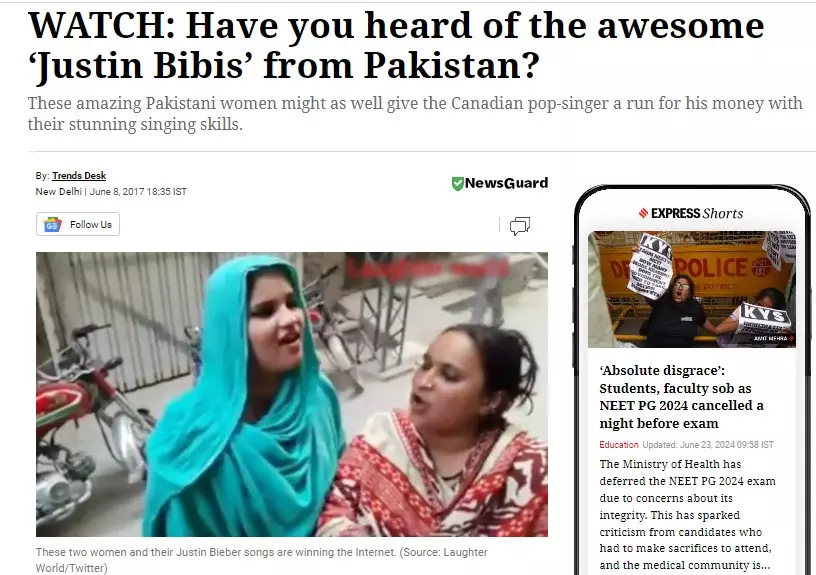 আরো সার্চ করে ভারতেরই আরেকটি গণমাধ্যম দি ইন্ডিয়ান এক্সপ্রেসের ওয়েবসাইটে ২০১৭ সালের ৮ জুন "Have you heard of the awesome ‘Justin Bibis’ from Pakistan?" শিরোনামে আরেকটি প্রতিবেদন খুঁজে পাওয়া যায়। ওই প্রতিবেদনেও ভিডিওটিতে দেখানো দুই নারীকে পাকিস্তানি বলে উল্লেখ করা হয়। তবে, প্রতিবেদনটিতে ওই দুই নারীকে পাকিস্তানের বলে উল্লেখ করা হলেও তাদের বিস্তারিত পরিচয় উল্লেখ করা হয়নি। স্ক্রিনশট দেখুন--