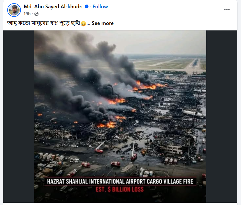 গত ১৯ অক্টোবর 'Md. Abu Sayed Al-khudr' নামের একটি ফেসবুক আইডি থেকে ছবিটি পোস্ট করে উল্লেখ করা হয়, “আহ্ কতো মানুষের স্বপ্ন পুড়ে ছাই!😥 অগ্নিকাণ্ডে ক্ষতির পরিমাণ কোটি কোটি ডলারে! হজরত শাহজালাল আন্তর্জাতিক বিমানবন্দরের কার্গো ভিলেজে ভয়াবহ অগ্নিকাণ্ডে প্রায় ১ বিলিয়ন ডলারের ক্ষতি হয়েছে, যা প্রায় একশ ২১ হাজার ৭০০ কোটি টাকার সমান। এই ক্ষতি অনেক দেশের পুরো জিডিপির থেকেও বেশি।” নিচে পোস্টটির স্ক্রিনশট দেখুন--