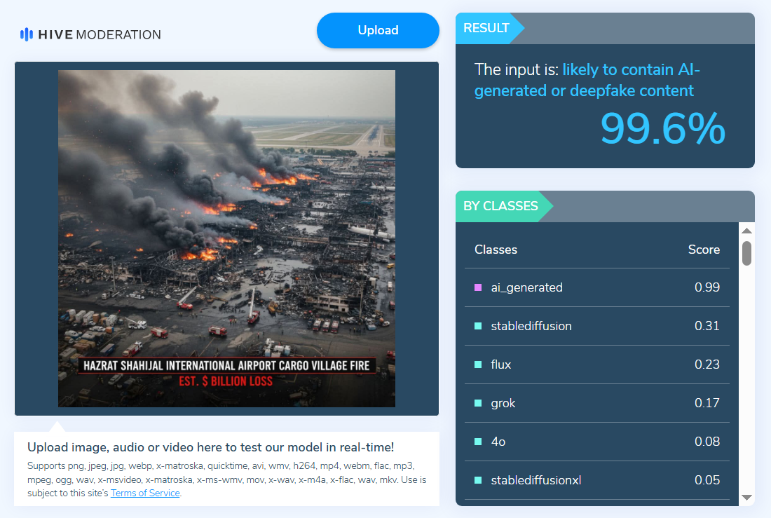 পরবর্তীতে, এআই ছবি শনাক্তের টুল 'হাইভ' ব্যবহার করে ছবিগুলো যাচাই করা হয়। টুলটি ছবিটিকে সম্ভাব্য এআই দ্বারা তৈরি ছবি হিসেবে ফলাফল প্রদান করেছে। ছবিটির ফলাফলের স্ক্রিনশট দেখুন--