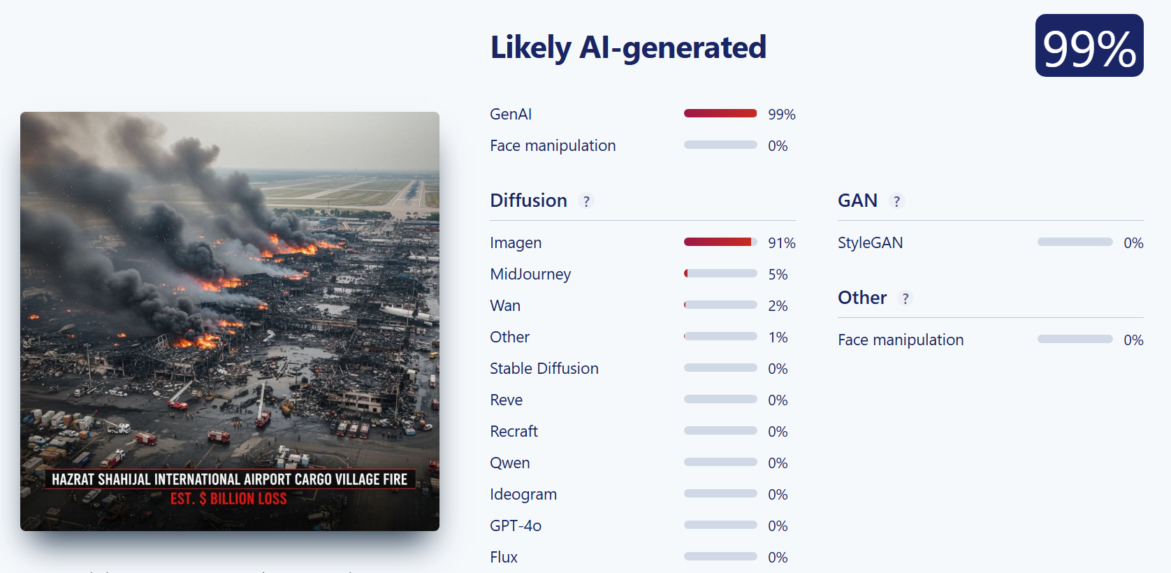সুতরাং এআই প্রযুক্তিতে তৈরি ছবিকে সম্প্রতি হযরত শাহজালাল আন্তর্জাতিক বিমানবন্দরে অগ্নিকাণ্ডের ঘটনায় সবকিছু পুড়ে যাওয়ার দৃশ্য বলে প্রচার করা হচ্ছে ফেসবুকে, যা বিভ্রান্তিকর।