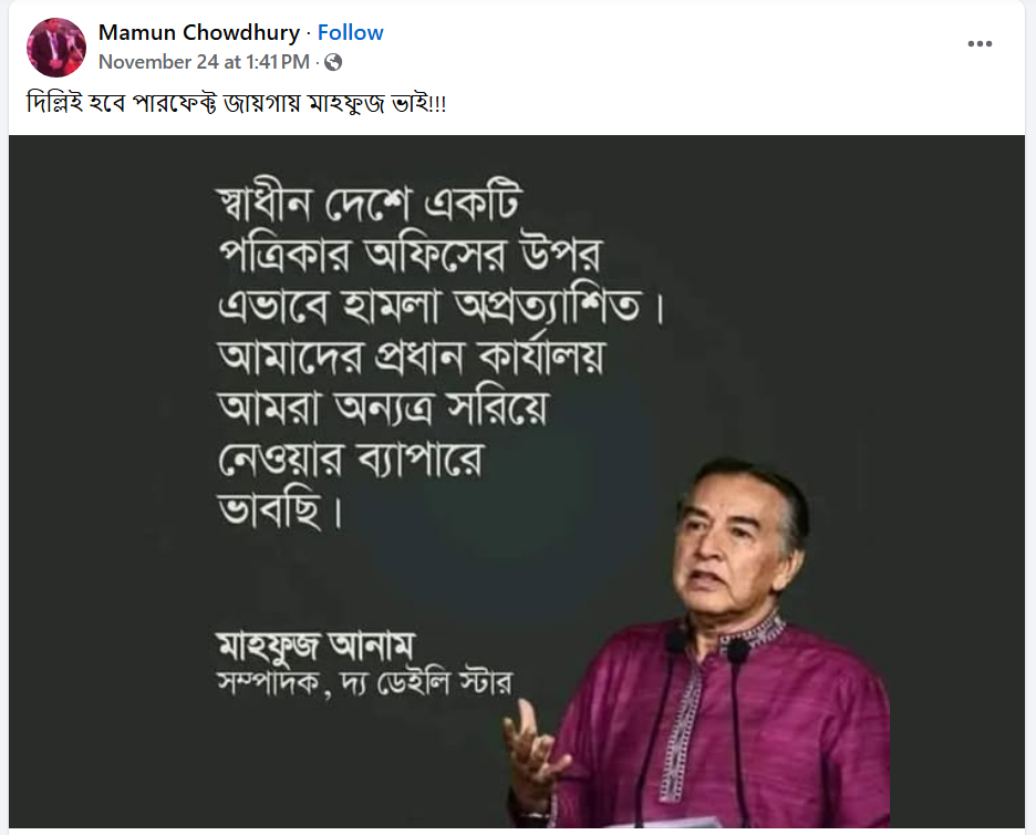 অর্থাৎ ডেইলি স্টার পত্রিকার অফিস অন্যত্র সরিয়ে নেয়ার ব্যাপারে কোনো মন্তব্য করেনি পত্রিকাটির সম্পাদক মাহফুজ আনাম। তার নামে প্রচার হওয়া মন্তব্যযুক্ত ফটোকার্ডটি ভুয়া।