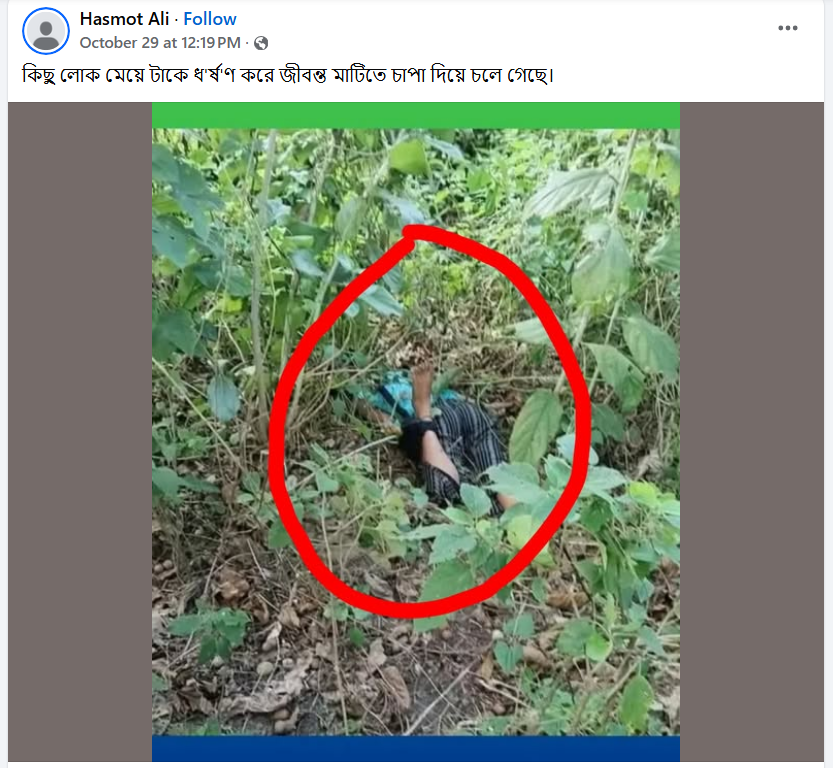 গত ২৯ অক্টোবর ‘Hasmot Ali’ নামক একটি আইডি থেকে একটি ছবি পোস্ট করে উল্লেখ করা হয়, “কিছু লোক মেয়ে টাকে ধ'র্ষ'ণ করে জীবন্ত মাটিতে চাপা দিয়ে চলে গেছে।” নিচে পোস্টটির স্ক্রিনশট দেখুন--