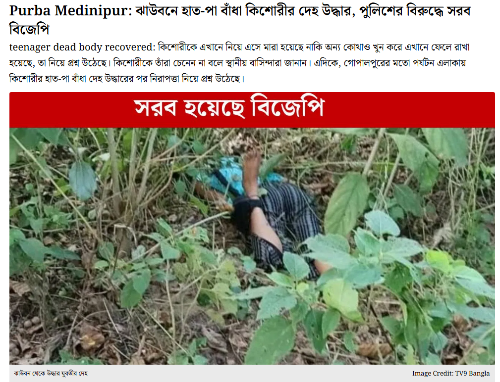 ফেসবুকে আলোচ্য দাবিতে প্রচারিত ছবিটির রিভার্স ইমেজ সার্চ করে “ঝাউবনে হাত-পা বাঁধা কিশোরীর দেহ উদ্ধার, পুলিশের বিরুদ্ধে সরব বিজেপি” শিরোনামে অনলাইন নিউজ পোর্টাল ‘টিভি৯ বাংলা’র ওয়েবসাইটে একটি প্রতিবেদন খুঁজে পাওয়া যায়। ২৬ অক্টোবর প্রকাশিত প্রতিবেদনে প্রকাশিত ছবির সঙ্গে ফেসবুকে আলোচ্য দাবিতে প্রচারিত ছবির মিল পাওয়া যায়। যেখানে বলা হয়, ঝাউবন থেকে কিশোরীর হাত-পা বাঁধা দেহ উদ্ধার হল। মৃতার নাম অর্চনা পণ্ডিত (১৫)। ঘটনাকে কেন্দ্র করে চাঞ্চল্য ছড়াল পূর্ব মেদিনীপুরের কাঁথির জুনপুট থানার গোপালপুরে। কিশোরীর দেহ উদ্ধার করে ময়নাতদন্তের জন্য পাঠিয়েছে পুলিশ। মৃত্যুর কারণ ময়নাতদন্তের পরই জানা যাবে বলে পুলিশ জানিয়েছে। জুনপুট থানার পুলিশের ভূমিকা নিয়ে প্রশ্ন তুলেছে বিজেপি। স্ক্রিনশট দেখুন--