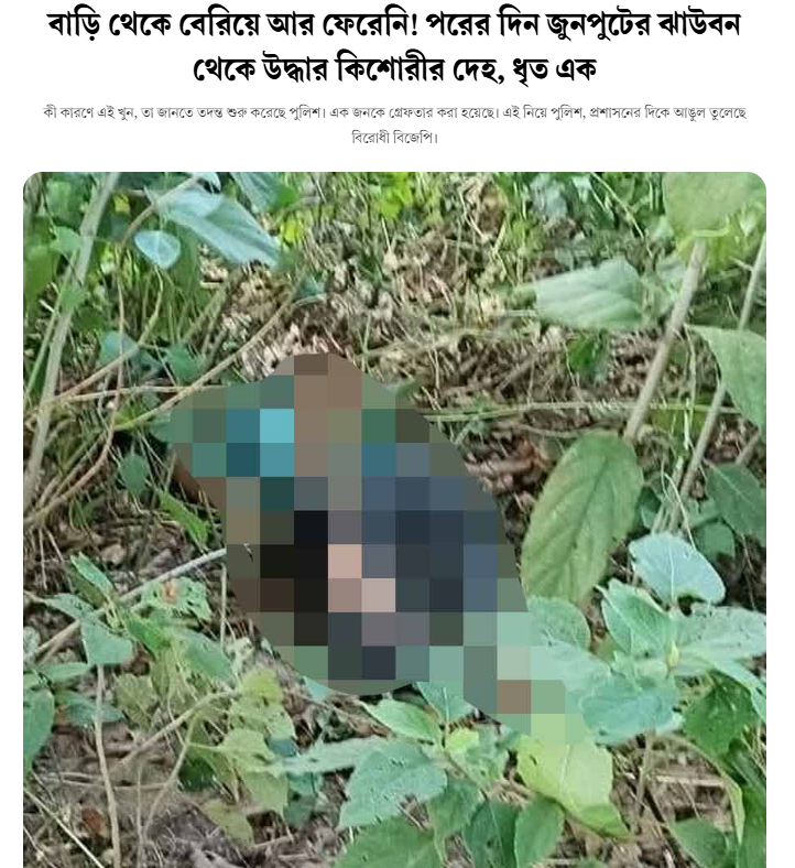 আলোচ্য তথ্যের ভিত্তিতে কি ওয়ার্ড সার্চ করে “বাড়ি থেকে বেরিয়ে আর ফেরেনি! পরের দিন জুনপুটের ঝাউবন থেকে উদ্ধার কিশোরীর দেহ, ধৃত এক” শিরোনামে ‘আনন্দবাজার’র পত্রিকার অনলাইনে আরো একটি প্রতিবেদন খুঁজে পাওয়া যায়। একই সময় গত ২৭ অক্টোবর প্রকাশিত প্রতিবেদনে প্রকাশিত মরদেহের ব্লার করা ছবির সঙ্গে ফেসবুকে প্রচারিত ছবির মিল পাওয়া যায়। যেখানে বলা হয়, কাঁথির জুনপুট সমুদ্র সৈকতের গোপালপুর এলাকায় ঝাউবনের ভিতর থেকে উদ্ধার হল ১৫ বছরের এক কিশোরীর হাত-পা বাঁধা দেহ। তার বাড়ি কাঁথি-২ দেশপ্রাণ ব্লকের সরদা গ্রাম পঞ্চায়েতের দূরমুঠ গ্রামে। পরিবার সূত্রে জানা গিয়েছে, শনিবার বিকেল নাগাদ ওই কিশোরী বাড়ি থেকে বেরিয়ে যায়। তার পর থেকে তার আর কোন খোঁজ পাওয়া যায়নি। এই ঘটনার তদন্তে নেমে ইতিমধ্যেই এক সন্দেহভাজন ব্যক্তিকে গ্রেফতার করা হয়েছে বলে জুনপুট থানা সূত্রে জানা গিয়েছে। স্ক্রিনশট দেখুন--