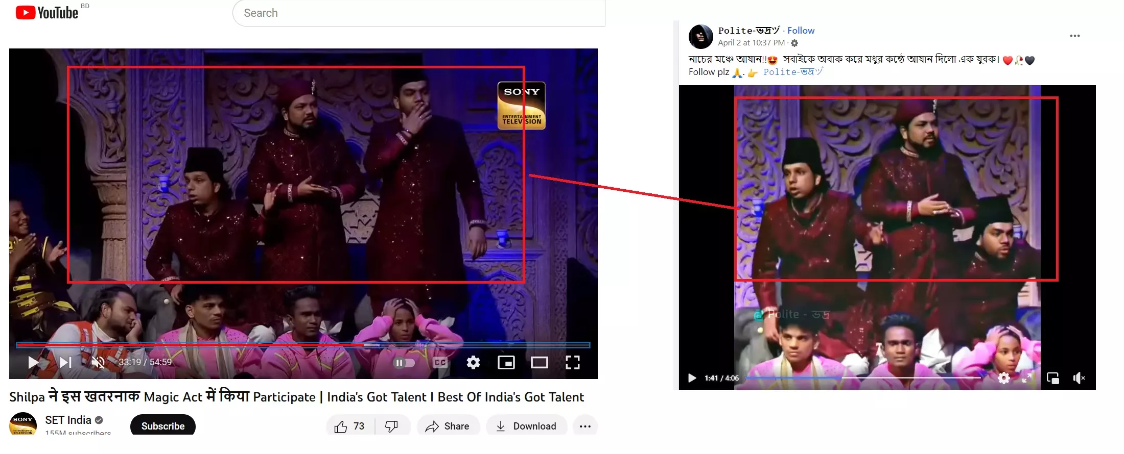 ভিডিওটি থেকে কি-ফ্রেম নিয়ে রিভার্স সার্চ করার পর, ফেসবুকে প্রচারিত আলোচ্য ভিডিওটিতে দুটি আলাদা রিয়্যালিটি শো'র ভিডিও থেকে বিভিন্ন অংশ কেটে যুক্ত করার প্রমাণ পাওয়া গেছে।