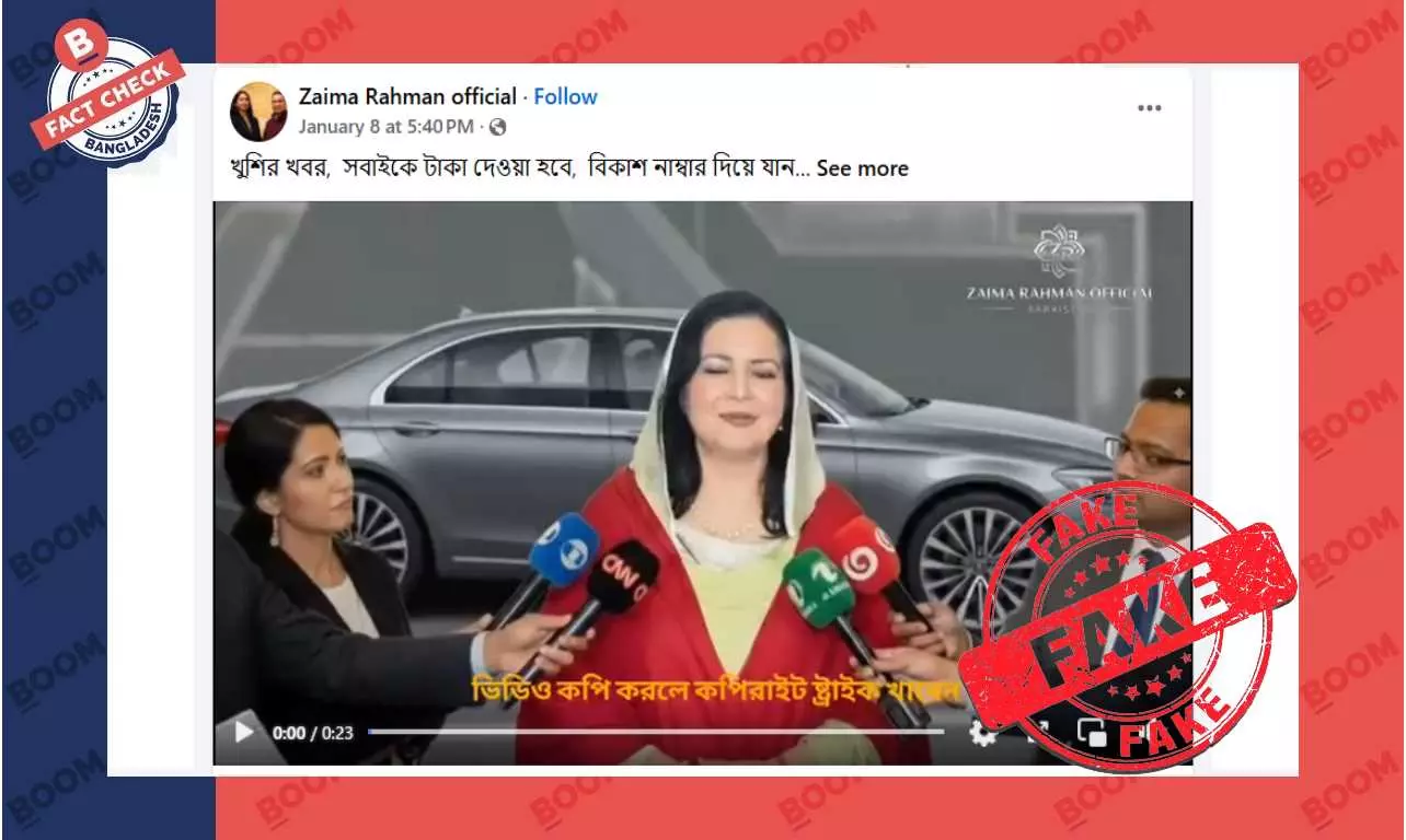 গত ৮ জানুয়ারি ‘Zaima Rahman official’ নামক একটি আইডি থেকে ভিডিওটি পোস্ট করে উল্লেখ করা হয়, “খুশির খবর, সবাইকে টাকা দেওয়া হবে, বিকাশ নাম্বার দিয়ে যান।” নিচে পোস্টটির স্ক্রিনশট দেখুন--
