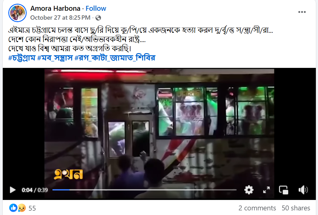 গত ২৭ অক্টোবর ‘Amora Harbona’ নামক একটি পেজ থেকে ভিডিওটি পোস্ট করে উল্লেখ করা হয়, “এইমাত্র চট্টগ্রামে চলন্ত বাসে ছু/রি দিয়ে কু/পি/য়ে একজনকে হত্যা করল দু/র্বৃ/ত্ত স/ন্ত্রা/সী/রা... দেশে কোন নিরাপত্তা নেই/অভিভাবকহীন রাষ্ট্র.... দেখে যাও বিশ্ব আমরা কত অগ্রগতি করছি। #চট্টগ্রাম #মব_সন্ত্রাস #রগ_কাটা_জামাত_শিবির।” নিচে পোস্টটির স্ক্রিনশট দেখুন--