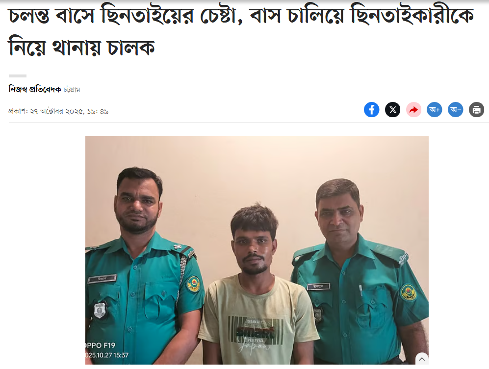 পাশাপাশি কি ওয়ার্ড সার্চ করে “চলন্ত বাসে ছিনতাইয়ের চেষ্টা, বাস চালিয়ে ছিনতাইকারীকে নিয়ে থানায় চালক” শিরোনামে ‘প্রথম আলো’র অনলাইনে একটি প্রতিবেদন খুঁজে পাওয়া যায়। গত ২৭ অক্টোবর প্রকাশিত প্রতিবেদনে কোনো মারা যাওয়ার তথ্য খুঁজে পাওয়া যায়নি। যেখানে আলোচ্য ঘটনা সম্পর্কে বলা হয়, চলন্ত বাসে মুঠোফোন ছিনতাই করতে গিয়ে ধরা পড়েন যাত্রী বেশে ওঠা এক ছিনতাইকারী। এরপর নেমে যেতে চেষ্টা করেন তিনি, ছুরিকাঘাত করেন চালকের সহকারীকে। তবে তাঁকেসহ চালক বাস চালিয়ে নিয়ে যান নিকটবর্তী থানায়। সেখানে পুলিশ তাঁকে গ্রেপ্তার করে। চট্টগ্রাম নগরের কাস্টমস মোড় এলাকায় গতকাল রোববার দিবাগদ রাত ১২টার দিকে এ ঘটনা ঘটেছে। গ্রেপ্তার ছিনতাইকারীর নাম আকবর হোসেন (২৪)। এ ঘটনায় আকবরের তিন সহযোগী বাসের জানালা দিয়ে পালিয়ে যান। স্ক্রিনশট দেখুন--