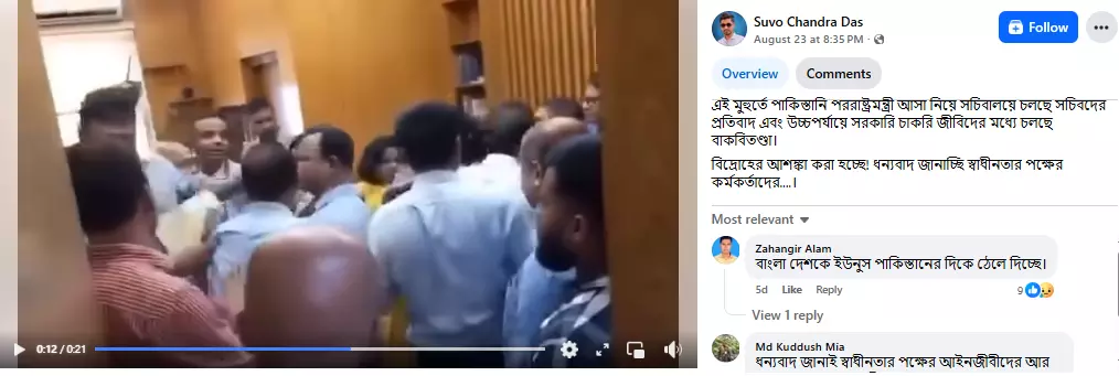 সামাজিক মাধ্যম ফেসবুকে কিছু সংখ্যক ব্যক্তির হট্টগোলের একটি ভিডিও শেয়ার করে বলা হচ্ছে, পাকিস্তানের উপপ্রধানমন্ত্রী ও পররাষ্ট্রমন্ত্রী ইসহাক দারের সম্প্রতি বাংলাদেশে সফরের প্রতিবাদে সচিবালয়ে সচিবদের প্রতিবাদের ঘটনা ঘটেছে। এরকম কয়েকটি ফেসবুক পোস্ট দেখুন এখানে, এখানে, এখানে, এখানে ও এখানে।