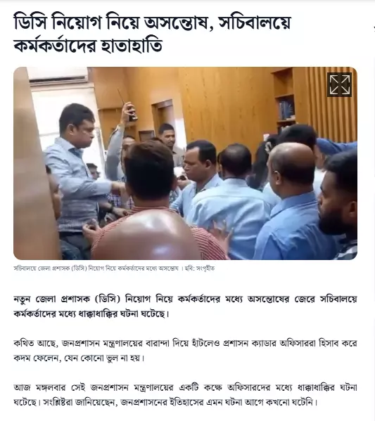 আরো সার্চ করে দৈনিক পত্রিকা ডেইলি স্টার বাংলার অনলাইন ভার্সনে ২০২৪ সালের ১১ সেপ্টেম্বর "ডিসি নিয়োগ নিয়ে অসন্তোষ, সচিবালয়ে কর্মকর্তাদের হাতাহাতি" শিরোনামে একটি প্রতিবেদনে আলোচ্য ভিডিওটির মত একটি দৃশ্য খুঁজে পাওয়া যায়। উক্ত প্রতিবেদনে বলা হয়, "নতুন জেলা প্রশাসক (ডিসি) নিয়োগ নিয়ে কর্মকর্তাদের মধ্যে অসন্তোষের জেরে সচিবালয়ে কর্মকর্তাদের মধ্যে ধাক্কাধাক্কির ঘটনা ঘটেছে। কথিত আছে, জনপ্রশাসন মন্ত্রণালয়ের বারান্দা দিয়ে হাঁটলেও প্রশাসন ক্যাডার অফিসাররা হিসাব করে কদম ফেলেন, যেন কোনো ভুল না হয়। আজ মঙ্গলবার সেই জনপ্রশাসন মন্ত্রণালয়ের একটি কক্ষে অফিসারদের মধ্যে ধাক্কাধাক্কির ঘটনা ঘটেছে। সংশ্লিষ্টরা জানিয়েছেন, জনপ্রশাসনের ইতিহাসের এমন ঘটনা আগে কখনো ঘটেনি।" স্ক্রিনশট দেখুন--