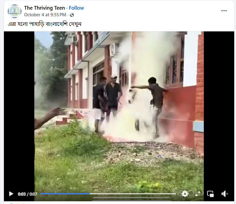 গত ৪ অক্টোবর ‘The Thriving Teen’ নামক একটি আইডি থেকে একটি ভিডিও পোস্ট করে উল্লেখ করা হয়, “এরা হলো পাহাড়ি বাংলাদেশি দেখুন।” নিচে পোস্টটির স্ক্রিনশট দেখুন--