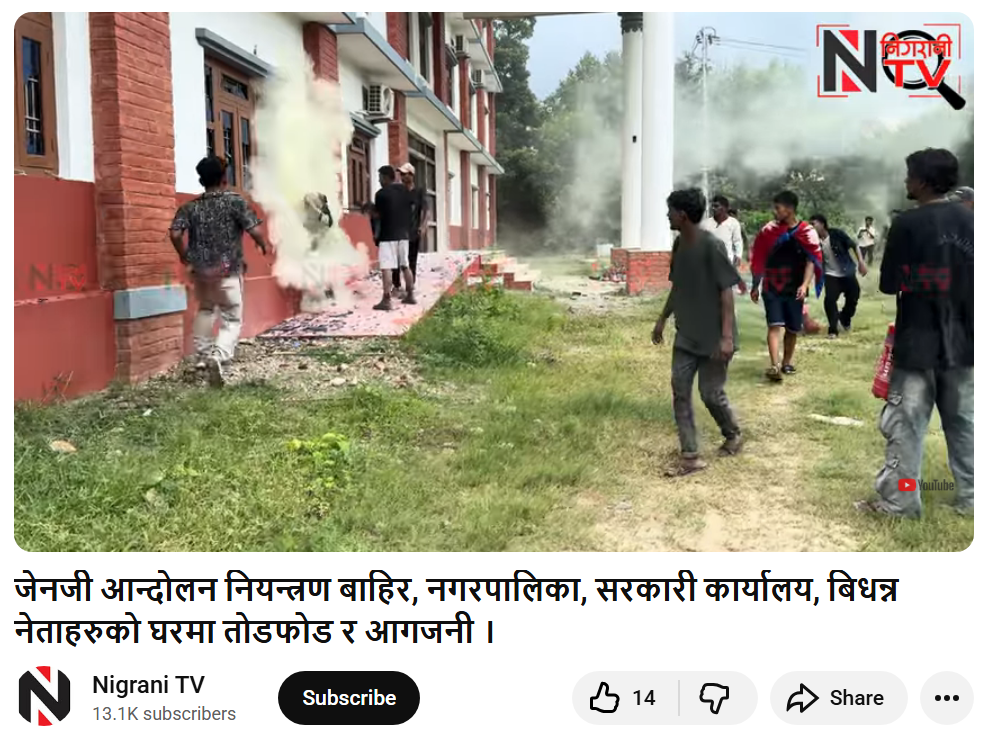 ফেসবুকে প্রচারিত ভিডিওটির কি ফ্রেম নিয়ে রিভার্স ইমেজ সার্চ করে ‘जेनजी आन्दोलन नियन्त्रण बाहिर, नगरपालिका, सरकारी कार्यालय, बिधन्न नेताहरुको घरमा तोडफोड र आगजनी’র শিরোনামে নেপাল ভিত্তিক সংবাদমাধ্যম ‘Nigrani TV’ এর ইউটিউব চ্যানেলে একটি ভিডিও খুঁজে পাওয়া যায়। ২০২৫ সালের ১০ সেপ্টেম্বর প্রকাশিত ১৮ মিনিট ১৯ সেকেন্ডের ভিডিওর ১২ মিনিট ১৩ সেকেন্ডে থাকা দৃশ্যের সঙ্গে ফেসবুকে আলোচ্য দাবিতে প্রচারিত ভাইরাল ভিডিওর মিল পাওয়া যায়। যেখানে বলা হয়, জেনজি আন্দোলন নিয়ন্ত্রণের বাইরে, পৌরসভা, সরকারি কার্যালয় এবং বিভিন্ন নেতার বাড়িতে ভাঙচুর ও অগ্নিসংযোগ। স্ক্রিনশট দেখুন--